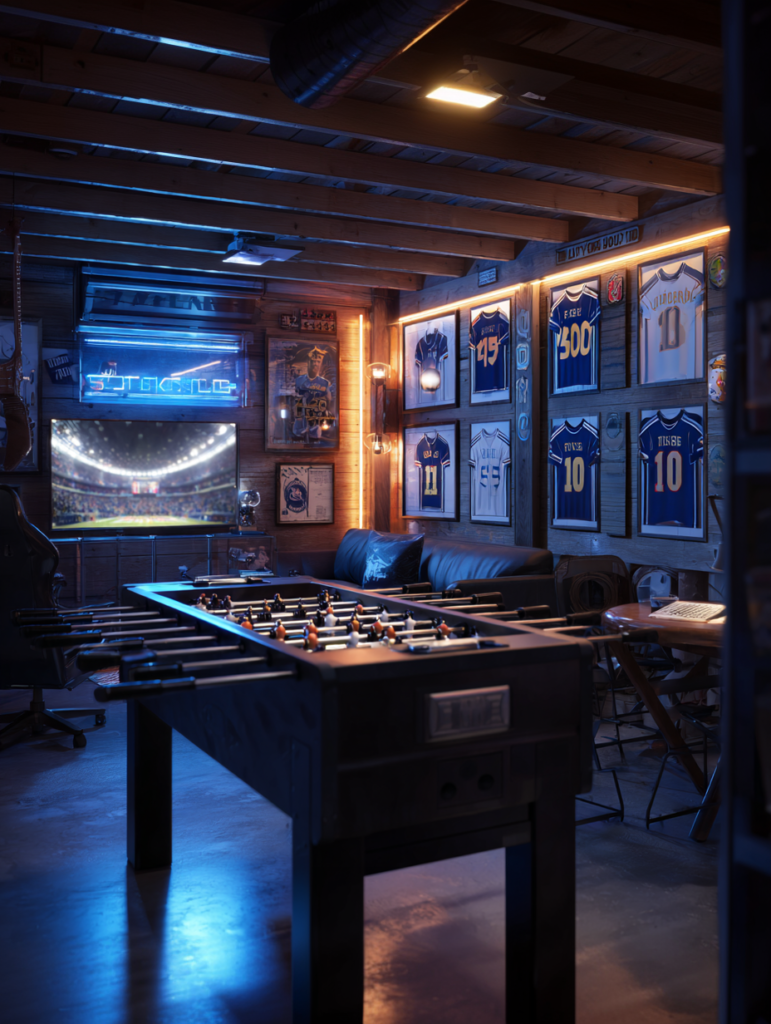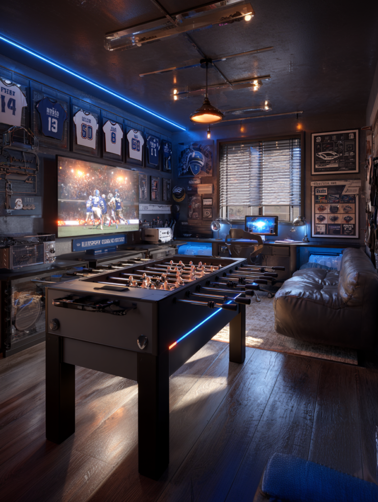 Our Midjourney generation for this style features a “high-performance” foosball table—the kind you’d see in a professional tournament. The room is packed with ideas for sports fans: framed jerseys, vintage posters, and LED strip lighting that can change colors to match your team’s jersey on game day.