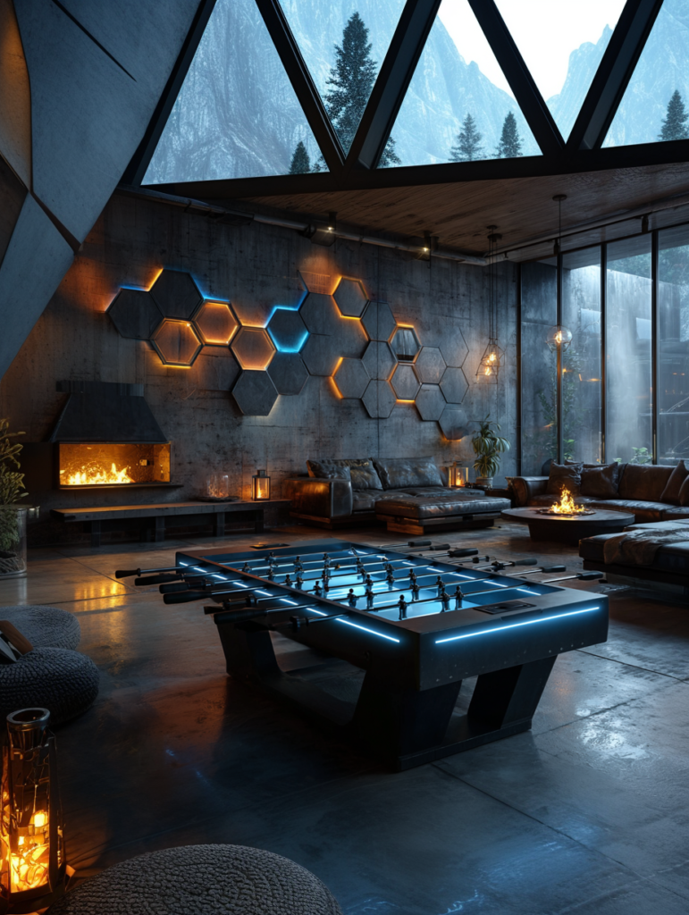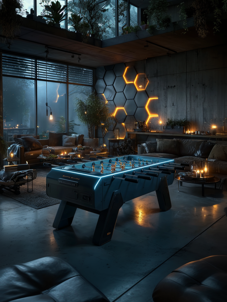 Using Midjourney, we envisioned a space that feels like it’s pulled straight from a sci-fi blockbuster. We’re talking about a foosball table with integrated LED glowing edges and a sleek, matte-black finish. This is the ultimate choice for a modern man cave shed or a basement converted into a high-tech gaming hub.