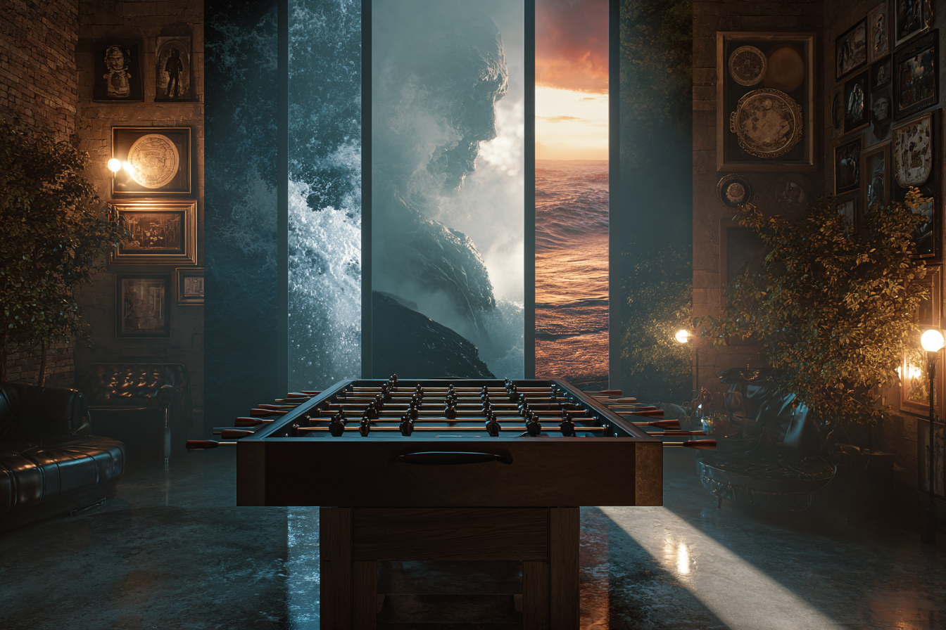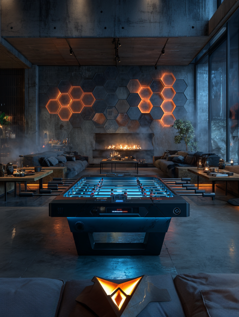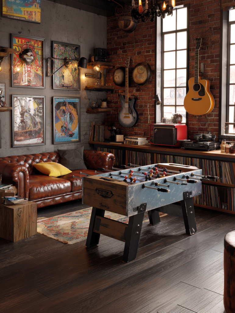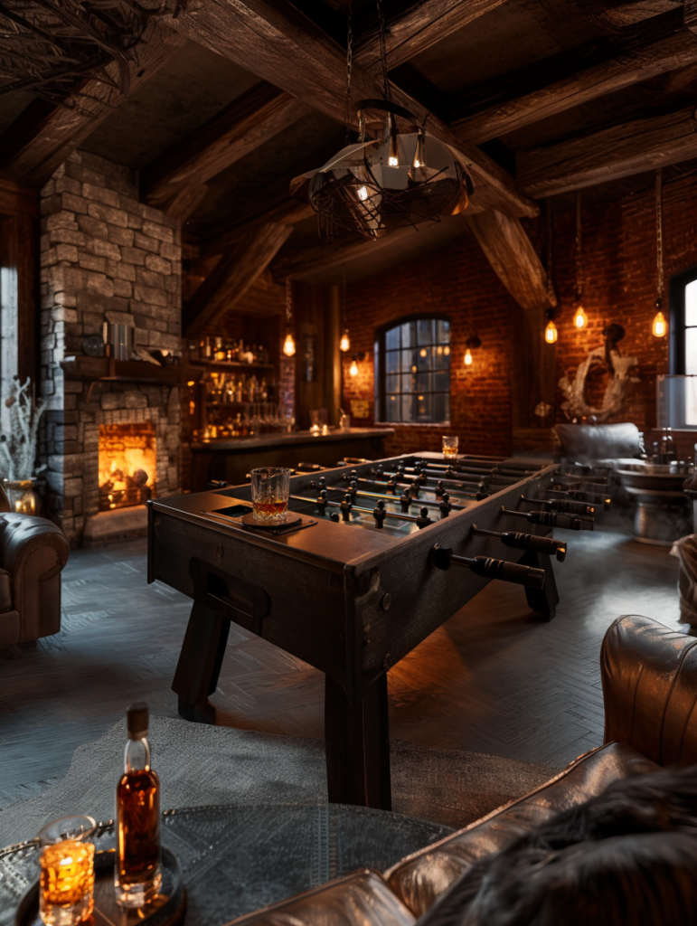 In the world of man cave decorations, nothing beats the classic, competitive energy of a foosball table. It’s not just a game; it’s the heart of the room. To help you visualize your dream setup, we used Midjourney to generate four distinct design concepts. From industrial luxury to futuristic neon hubs, here is how you can transform your space using these professional ideas.