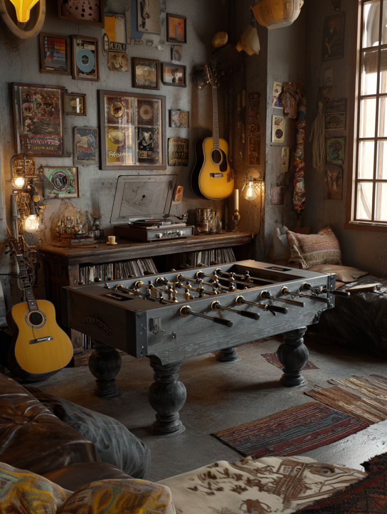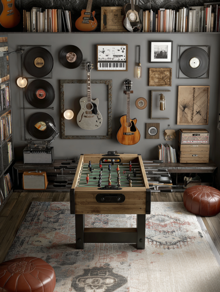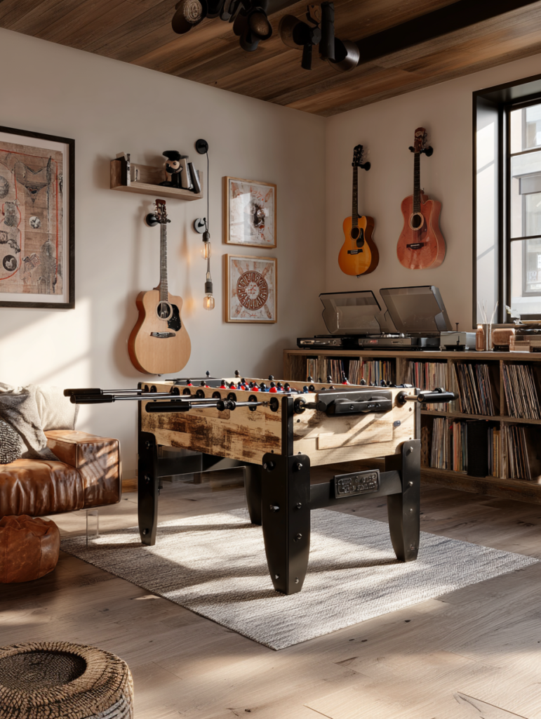 In this concept, the foosball table is a vintage-style piece that sits comfortably among record players, wall-mounted guitars, and travel photography. This is the perfect man cave furniture setup for the creative soul who wants a space to play music, listen to vinyl, and challenge a friend to a quick match.