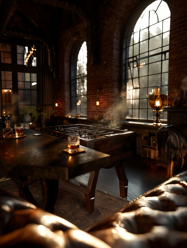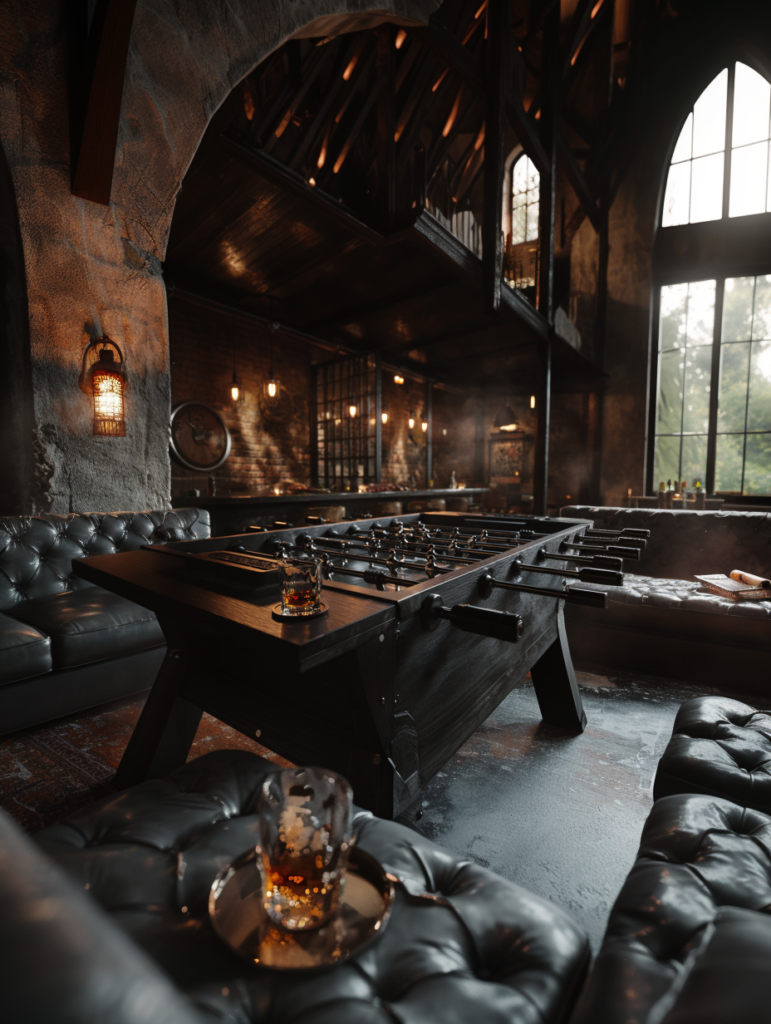 In this Midjourney concept, we focused on high-end man cave furniture that feels substantial. The centerpiece is a premium foosball table crafted from dark walnut wood and brushed steel. It’s a far cry from the plastic tables of your childhood; this is a piece of art.